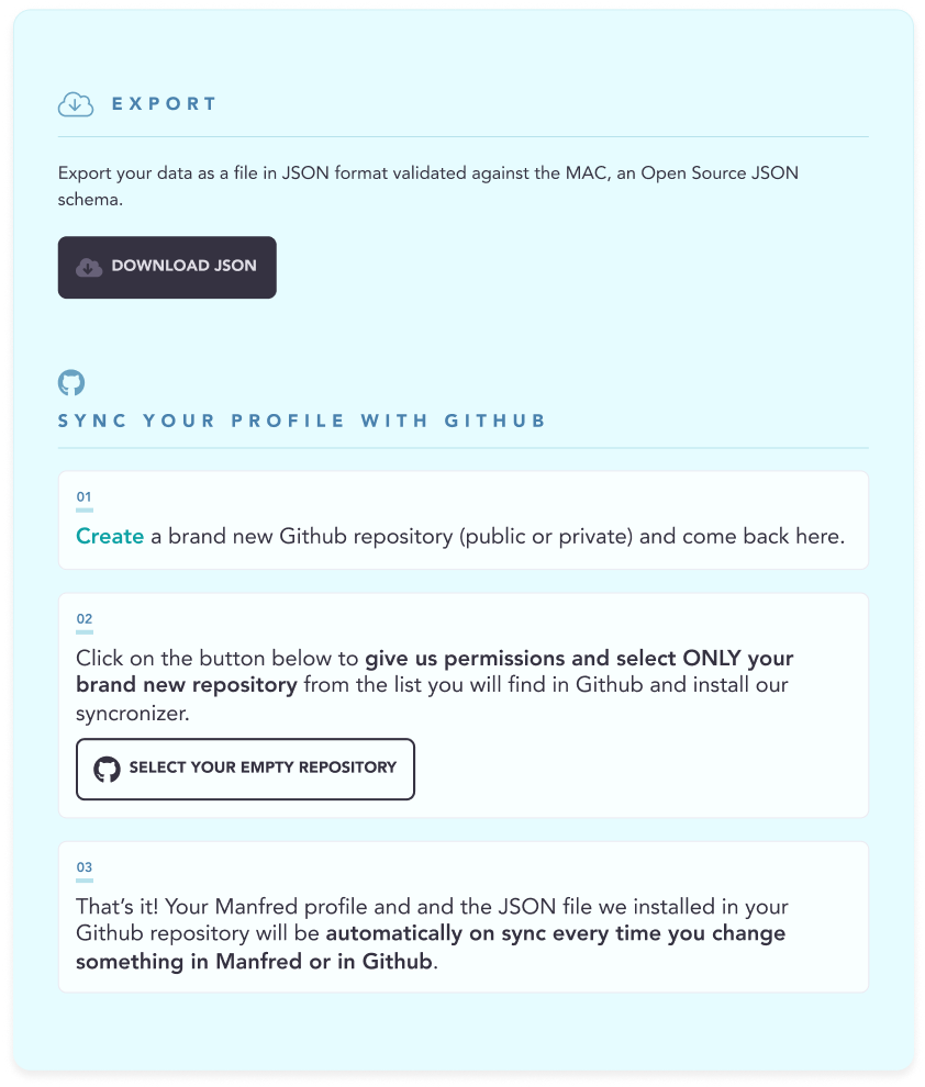 Manfred inició su andadura con la ambiciosa misión de revolucionar el panorama de reclutamiento y para ello decidió apostar por la transparencia total y una estrategia Open Data. Las plataformas de reclutamiento tradicionales se han caracterizado por ofrecer un acceso limitado a los datos personales, a menudo proporcionando archivos poco accionables como PDFs. Manfred apostó por ofrecer una propuesta de valor única ofreciendo una solución que empoderara a los desarrolladores para poseer sus datos en el formato de intercambio universal: JSON.